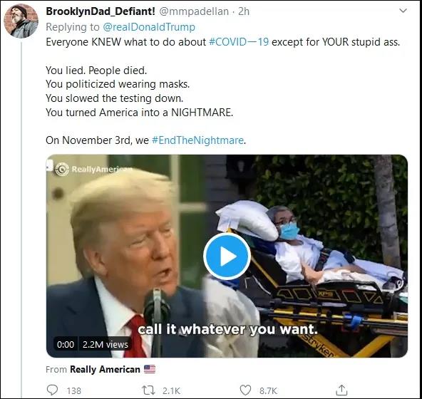 有的网友则直接了当地怒骂:“人人都知道怎么面对新冠,除了你这傻缺。你撒谎让人们死去,你把戴口罩政治化,你放缓检测,你让美国变成了一场噩梦。11月3日(大选日),我们该结束这场噩梦了。”